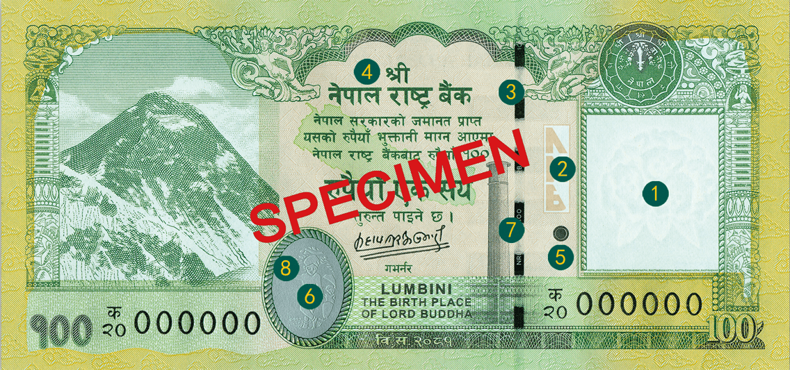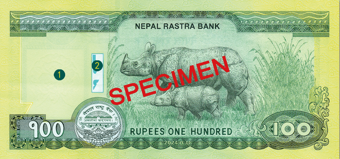 • Hold the banknote up to the light and you will see the text and numerals “NRB” and “100”. The thread will appear as a solid line.