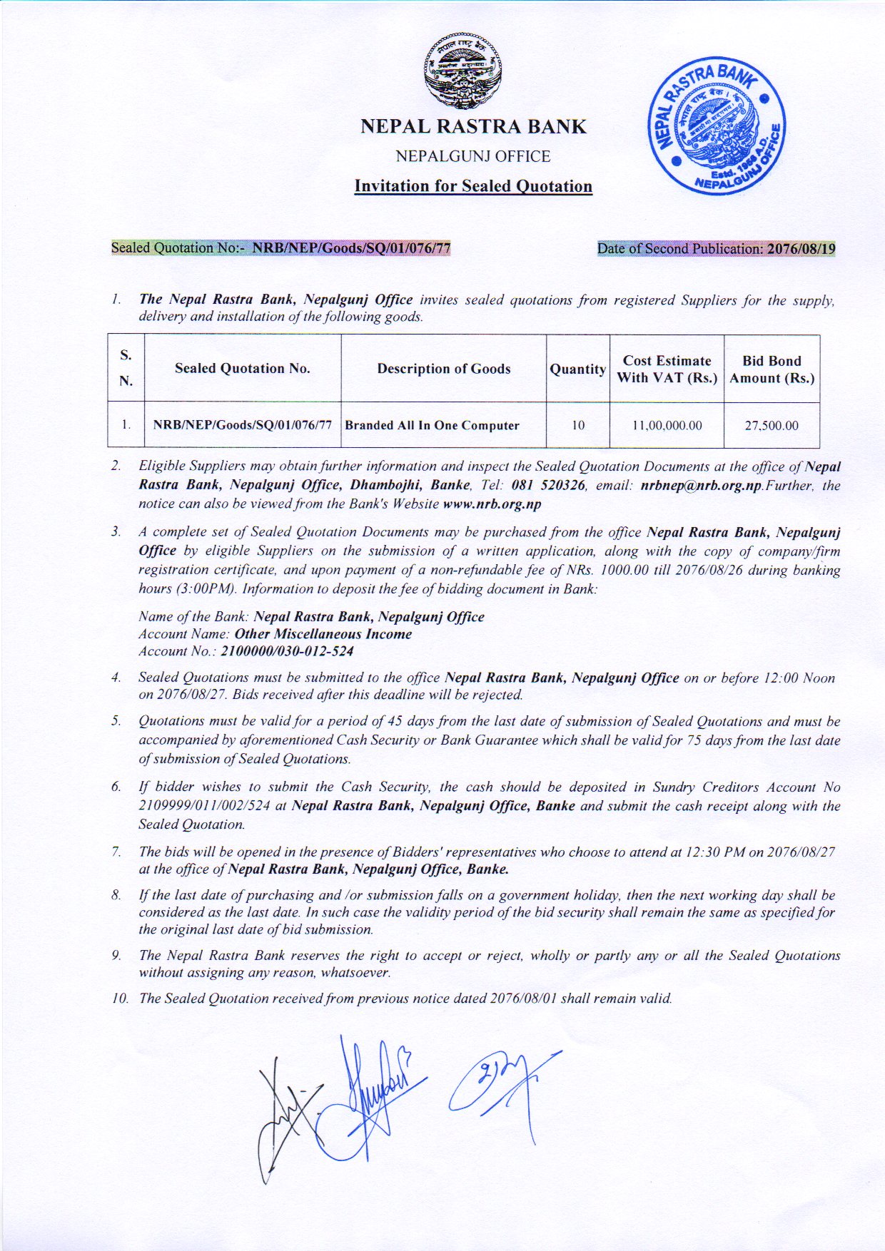 Nepalgunj Office – Re-Invitation for Sealed Quotations for the Supply, Delivery and Installation of Branded All in One Computer.
