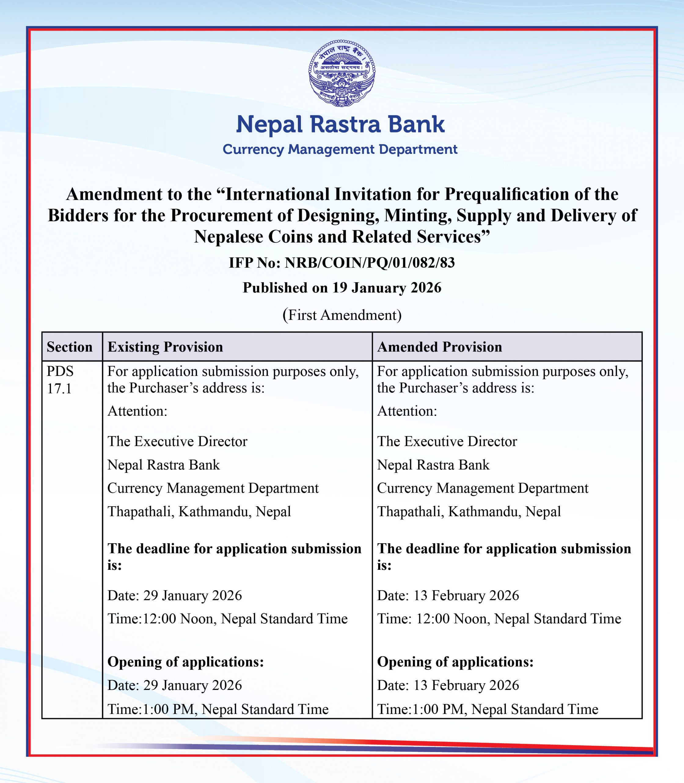 Amendment to the “International Invitation for Prequalification of the Bidders for the Procurement of Designing, Minting, Supply and Delivery of Nepalese Coins and Related Services” IFP No: NRB/COIN/PQ/01/082/83