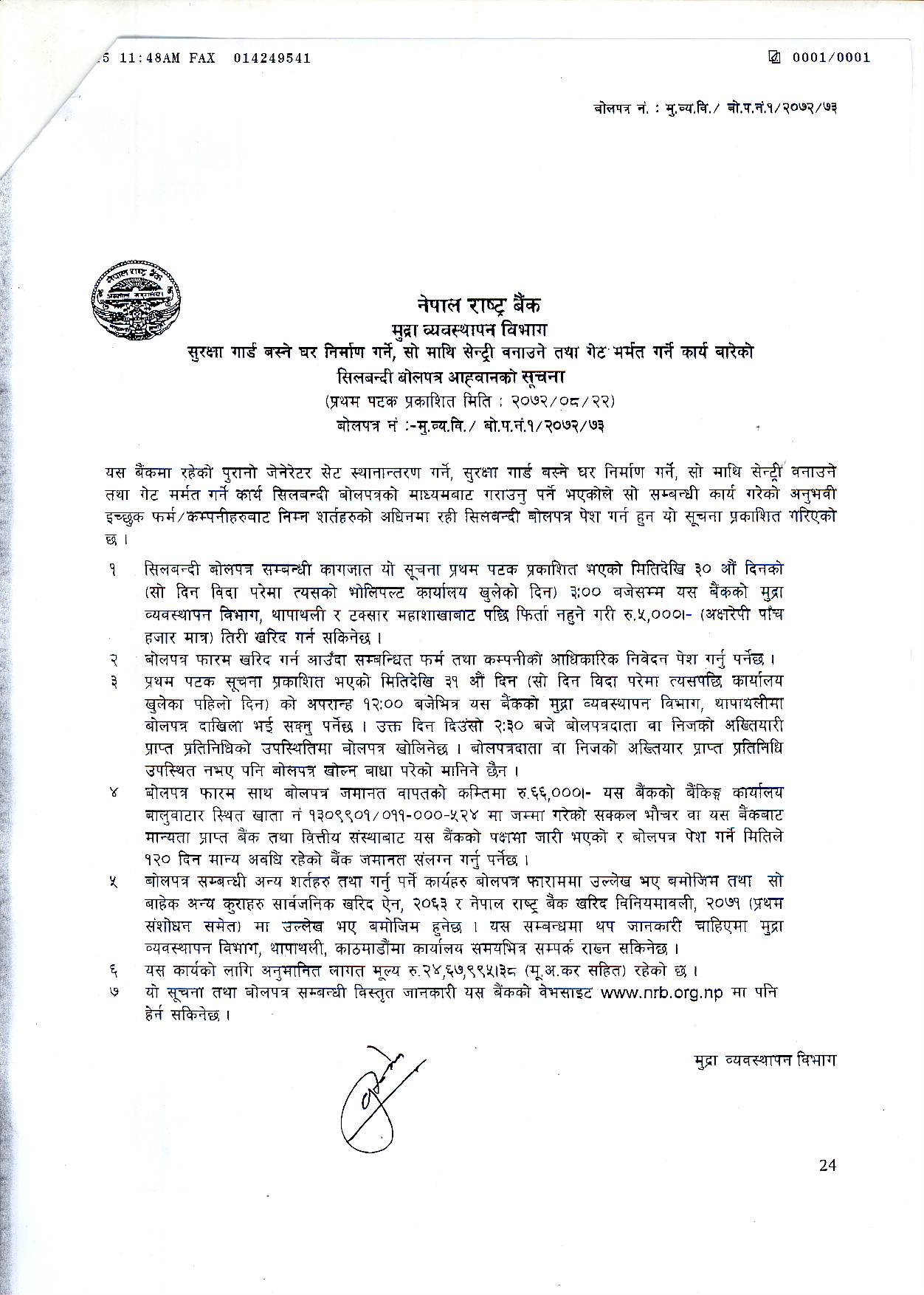 सुरक्षा गार्ड बस्ने घर निर्माण गर्ने, सो माथि सेन्ट्री बनाउने तथा गेट मर्मत गर्ने कार्य बारेको सिलबन्दी बोलपत्र आह्वानको सूचना